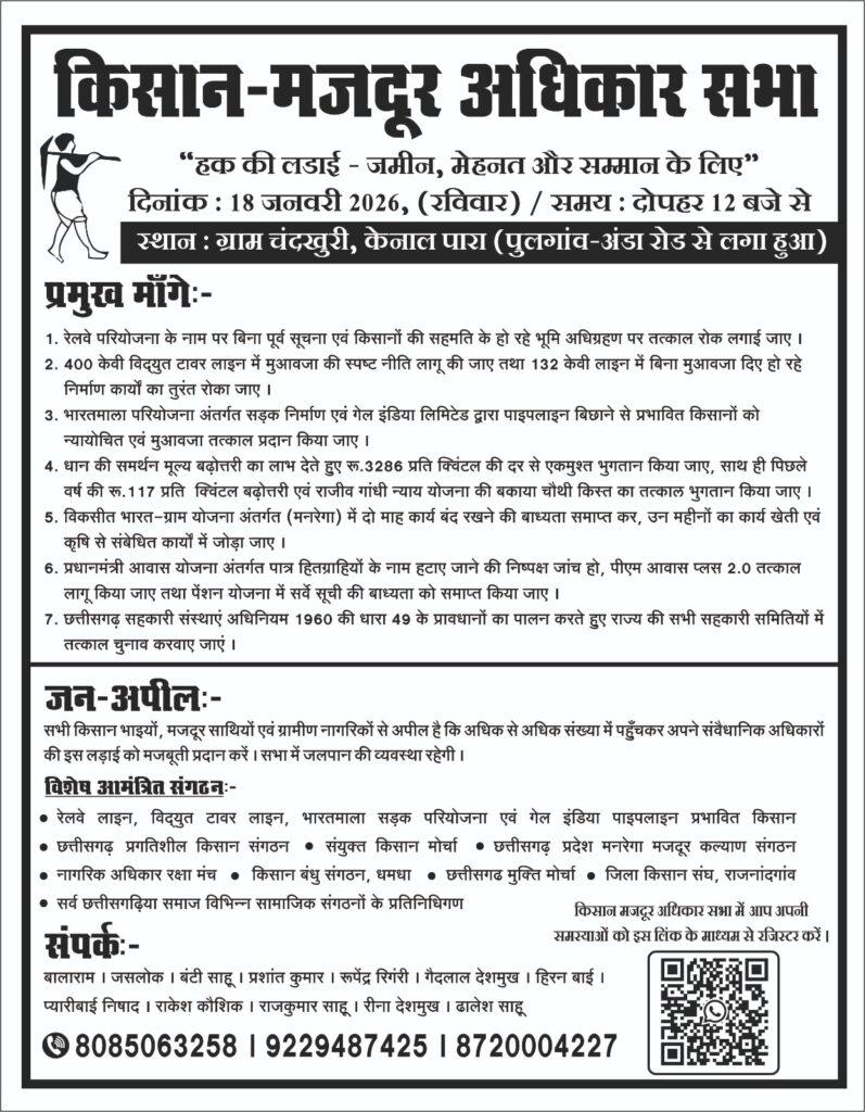 आगामी 18 जनवरी 2026 को मुआवजा प्रभावित किसानों की जिला स्तरीय बैठक चंदखुरी में रखी गई है किसानों ने बैठक में शामिल होने का निर्णय लिया है,