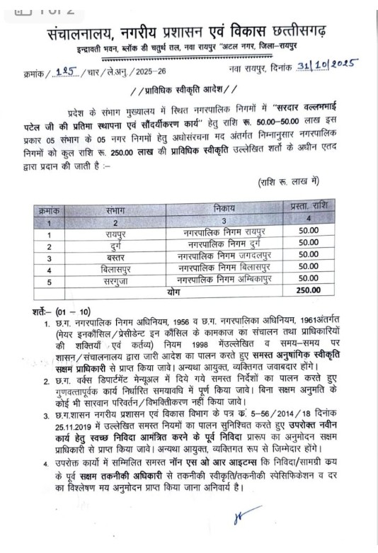 जारी आदेश के अनुसार, यह राशि सरदार पटेल की प्रतिमाओं की स्थापना और आसपास के क्षेत्र के सौंदर्यीकरण कार्य के लिए दी जा रही है। कार्यों को छत्तीसगढ़ नगरपालिका अधिनियम, 1961 एवं नगर निगम अधिनियम, 1956 के नियमों के अनुरूप पूरा किया जाएगा।