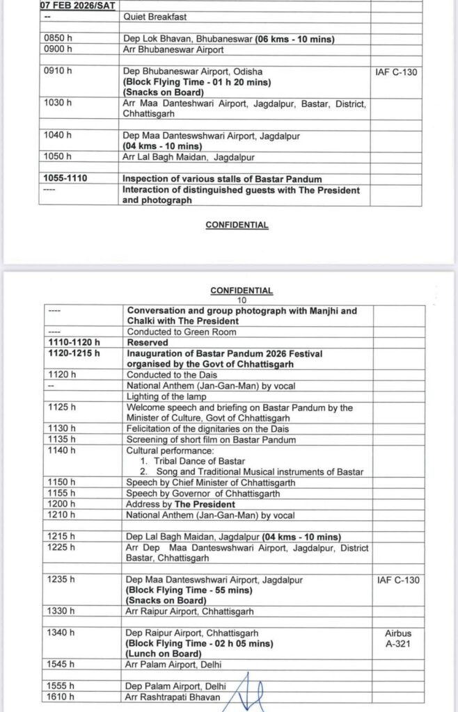 राष्ट्रपति के दौरे का मिनट टू मिनट प्रोटोकॉल लिस्ट 7 फरवरी 2026 शनिवार