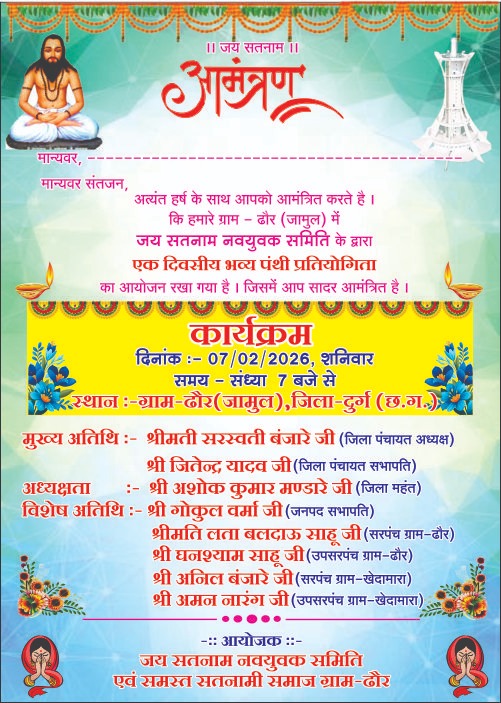 व अध्यक्षता अशोक कुमार मण्डारे जिला महंत, एवं विशेष अतिथि गोकुल वर्मा जनपद सदस्य एवं सभापति जनपद पंचायत दुर्ग ,श्रीमती लता बलदाऊ साहू सरपंच ग्राम पंचायत ढौर ,घनश्याम साहू उपसरपंच ग्राम पंचायत- ढौर,अनिल बंजारे सरपंच ग्राम पंचायत-खेदामारा व उप सरपंच ग्राम पंचायत खेदामारा अमन नारंग , एवं हेमंत चंदेल ब्लॉक अध्यक्ष सतनामी समाज बेरला आदि रहेंगे l