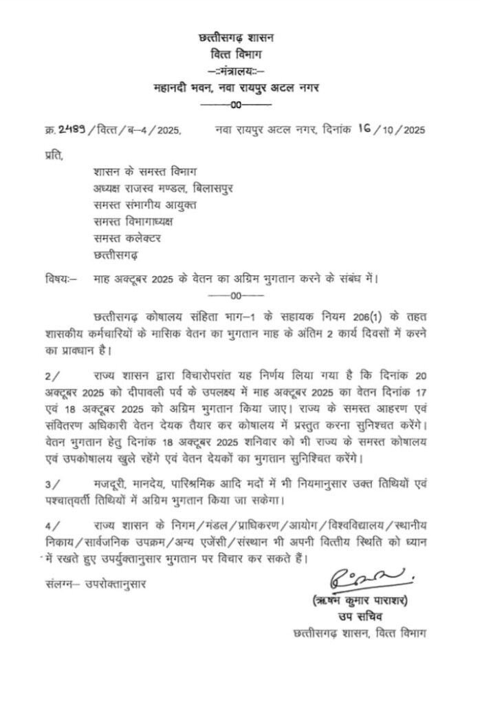 रायपुर 17 अक्टूबर : दीवाली से पहले छत्तीसगढ़ सरकार ने पौने चार लाख शासकीय कर्मियों के लिए बड़ी राहत की घोषणा की है। मुख्यमंत्री विष्णु देव साय की पहल पर राज्य शासन ने अक्टूबर 2025 का वेतन 17 व 18 अक्टूबर को अग्रिम रूप से भुगतान करने का निर्णय लिया है।