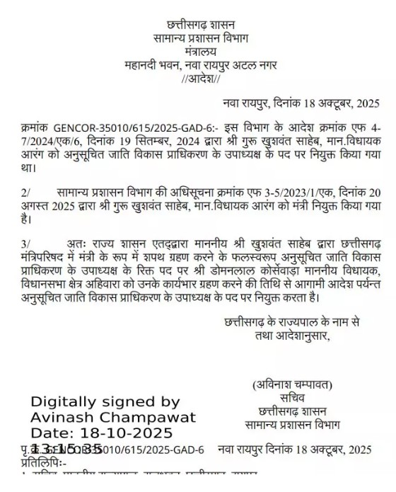 विभाग के आदेश क्रमांक एफ 4- 7/2024/एक/6, दिनांक 19 सितम्बर, 2024 द्वारा गुरू खुशवंत साहेब विधायक आरंग को अनुसूचित जाति विकास प्राधिकरण के उपाध्यक्ष के पद पर नियुक्त किया गया था। सामान्य प्रशासन विभाग की अधिसूचना क्रमांक एफ 3-5/2023/1/एक, दिनांक 20 अगस्त 2025 द्वारा गुरू खुशवंत साहेब विधायक आरंग को मंत्री नियुक्त किया गयाहै। अतः राज्य शासन एतद्वारा खुशवंत साहेब द्वारा छत्तीसगढ़ मंत्रिपरिषद में मंत्री के रूप में शपथ ग्रहण करने के फलस्वरूप अनुसूचित जाति विकास प्राधिकरण के उपाध्यक्ष के रिक्त पद पर डोमनलाल कोर्सेवाड़ा विधायक, विधानसभा क्षेत्र अहिवारा को उनके कार्यभार ग्रहण करने की तिथि से आगामी आदेश पर्यन्त अनुसूचित जाति विकास प्राधिकरण के उपाध्यक्ष के पद पर नियुक्त करता है।