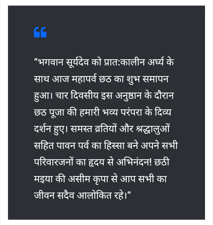 इस अवसर पर प्रधानमंत्री नरेंद्र मोदी ने भी सोशल मीडिया मंच X पर देशवासियों को छठ पर्व की बधाई दी। उन्होंने लिखा —