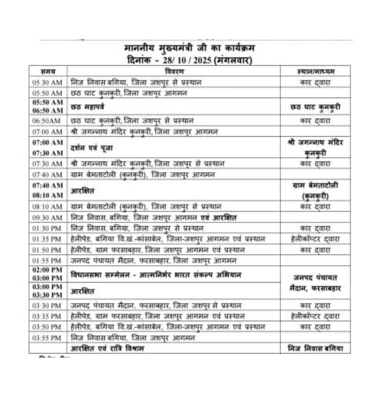 इसके बाद सीएम साय कुनकुरी में स्थित भगवान जगन्नाथ मंदिर में पूजा-अर्चना करेंगे। दोपहर करीब 2 बजे विधानसभा सम्मेलन में शामिल होंगे, जहां वे विभिन्न मुद्दों पर चर्चा करेंगे।