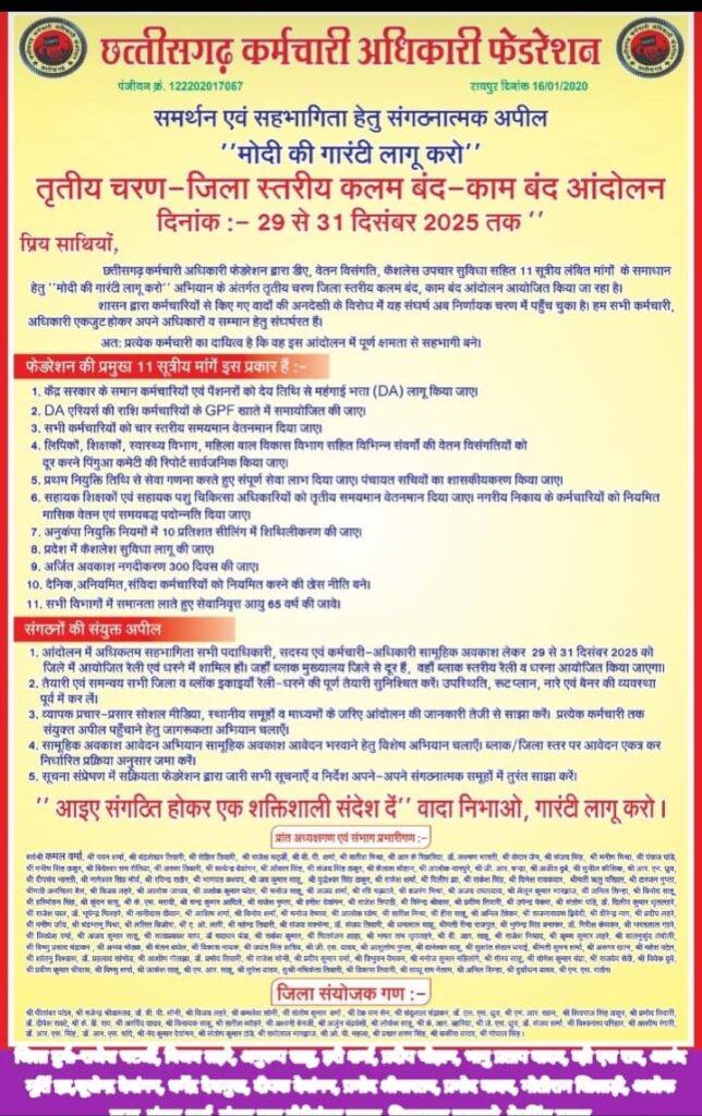 आदि संगठन के पदाधिकारीयों ने अपील किए है कि सरकार के सभी कर्मचारियों के लिए की गई घोषणा के सभी मुद्दों को लेकर छत्तीसगढ़ कर्मचारी अधिकारी फेडरेशन एवं फेडरेशन से संबंधित संगठनों के सभी पदाधिकारी गण अपने विभागीय कर्मचारी साथियों सहित 13 दिसंबर शनिवार को दोपहर 12:00 बजे की बैठक में जिला पंचायत दुर्ग के सभागार में उपस्थित होने का विशेष आग्रह किए है.