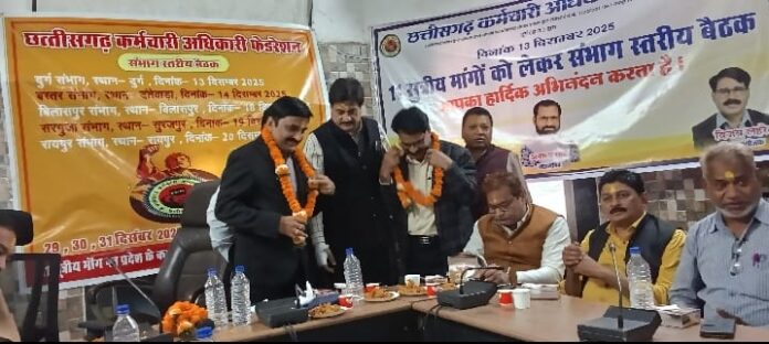 सीजी प्रतिमान न्यूज़ : दुर्ग / छत्तीसगढ कर्मचारी अधिकारी फेडरेशन दुर्ग संभाग की एक सभा 13 दिसंबर शनिवार को जनपद पंचायत दुर्ग के सभाकक्ष में फेडरेशन के प्रांतीय संयोजक कमल वर्मा की अध्यक्षता मे आहूत की गई थी जिसमें विशिष्ट रूप से प्रांतीय सचिव एवं दुर्ग संभाग प्रभारी राजेश चटर्जी, लिपिक संध प्रांताध्यक्ष संजयसिंह, प्रदेश लिपिक संध प्रांताध्यक्ष रोहित तिवारी, स्वास्थ्य एवं बहुददेशीय कर्मचारी संध प्रांताध्यक्ष पंकज पांडेय, मनोज कुमार साहू प्रांताध्यक्ष शालेय शिक्षक संध,संताष वर्मा कार्यकारी अध्यक्ष संचालनालय विभागाध्यक्ष कर्मचारी संध,संभागीय अध्यक्ष आनंद कुमार श्रीवास्तव, जिला संयोजक कर्मचारी अधिकारी फेडरेशन दुर्ग विजय लहरे, राजपत्रित अधिकारी संध जिलाध्यक्ष रूपेश पांडेय, अनुरूप साहू महासचिव कर्मचारी अधिकारी फेडरेशन उपस्थित थे.