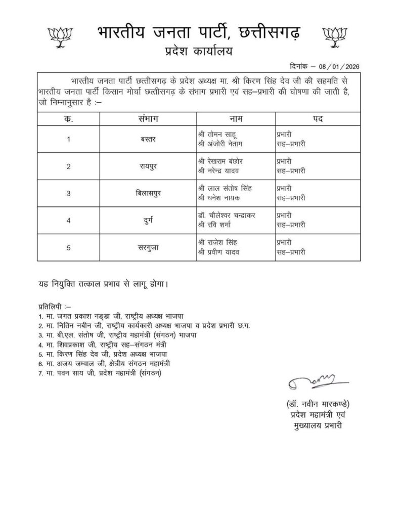 यह नियुक्ति 8 जनवरी 2026 गुरुवार को भारतीय जनता पार्टी छत्तीसगढ़ प्रदेश कार्यालय से जारी किया गया l
