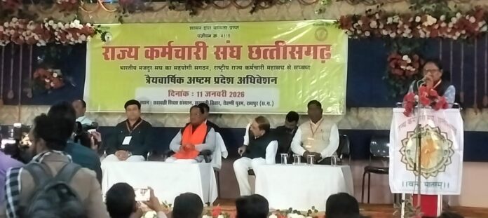 रायपुर 11 जनवरी / राज्य कर्मचारी संघ छत्तीसगढ़ के अष्टम त्रैवार्षिक अधिवेशन में मुख्य अतिथि के आसंदी से मुख्यमंत्री विष्णु देव साय ने कर्मचारियों के पांच प्रमुख मांगो जिनमें सभी कर्मचारियों को कैशलेश चिकित्सा सुविधा उपलब्ध कराने कर्मचारियों की समस्याओं के निराकरण करने प्रशासनिक न्यायाधिकरण की पुनः स्थापना करने के लिए उच्च स्तरीय समिति का गठन कर उनकी अनुशंसा को अतिशीघ्र लागू करने का आश्वासन दिए