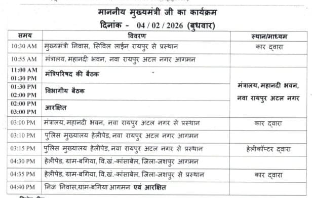 Homeप्रदेशछत्तीसगढ़ के मुख्यमंत्री विष्णु देव साय का 4 फरवरी 2026 बुधवार को... प्रदेश छत्तीसगढ़ के मुख्यमंत्री विष्णु देव साय का 4 फरवरी 2026 बुधवार को दौरा कार्यक्रम. By संपादक :- पन्ना लाल यादव 3 February 2026 0 116 Share FacebookTwitterPinterestWhatsApp रायपुर / छत्तीसगढ़ के मुख्यमंत्री विष्णु देव साय का 4 फरवरी 2026 बुधवार को दौरा कार्यक्रम. Share FacebookTwitterPinterestWhatsApp Previous articleछत्तीसगढ़ : शराब घोटाले मामला में सुप्रीम कोर्ट से पूर्व आबकारी मंत्री लखमा को मिली अंतरिम जमानत lNext articleब्रेकिंग न्यूज : मुख्यमंत्री विष्णु देव साय ने धान खरीदी की तारीख दो दिनों तक और बढ़ाने का लिया है फैसला, यानी किसान अपनी धान अब 5 और 6 फरवरी तक बेच सकेंगे। संपादक :- पन्ना लाल यादव RELATED ARTICLES प्रदेश झेरिया धोबी समाज परिक्षेत्र जामुल का एक दिवसीय वार्षिक सम्मेलन एवं सम्मान समारोह का आयोजन ग्राम ढौर में 3 मई रविवार को है आयोजित… 30 April 2026 प्रदेश मुख्यमंत्री विष्णु देव साय की अध्यक्षता में मंत्रालय महानदी भवन में आयोजित मंत्रिपरिषद की बैठक में आज कई अहम लिए गए फैसले। 29 April 2026 प्रदेश 29 April 2026 - Advertisment - - Advertisment - Most Popular भिलाई चेम्बर ऑफ कॉमर्स एण्ड इंडस्ट्रीज ने व्यापारियों से अपील की है कि वे अपने दस्तावेज व्यवस्थित रखें और GST नियमों के तहत अपडेट... झेरिया धोबी समाज परिक्षेत्र जामुल का एक दिवसीय वार्षिक सम्मेलन एवं सम्मान समारोह का आयोजन ग्राम ढौर में 3 मई रविवार को है आयोजित… रामलला दर्शन योजना के तहत दुर्ग से श्रद्धालुओं का जत्था हुआ रवाना छत्तीसगढ़ में प्रवर्तन निदेशालय (ED) की टीम ने दुर्ग और बिलासपुर में रेड मारी है। दुर्ग में ‘अमर इंफ्रा’ के संचालक और भाजपा नेता... Load more
