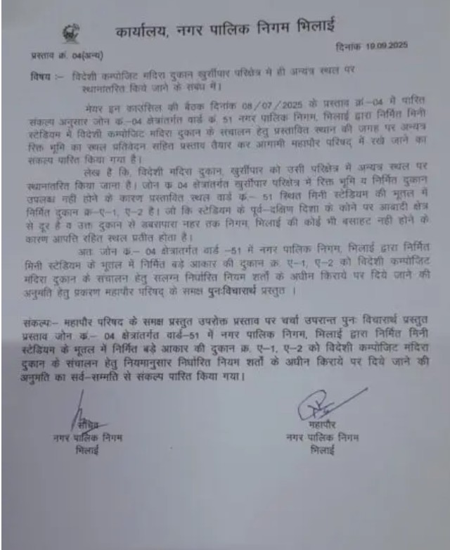 महिलाओं के अथक प्रयास और जन दबाव के सामने प्रशासन को झुकना पड़ा। नगर पालिक निगम भिलाई के संकल्प क्रमांक 04(अमध्य) के अनुसार, शराब भट्टी को प्रस्तावित स्थान से हटाकर ‘स्टेडियम’ में स्थानांतरित करने का निर्णय लिया गया है। निगम द्वारा वार्ड 51 की जनता के हित में लिए गए इस सार्थक फैसले का क्षेत्रवासियों ने स्वागत किया है।