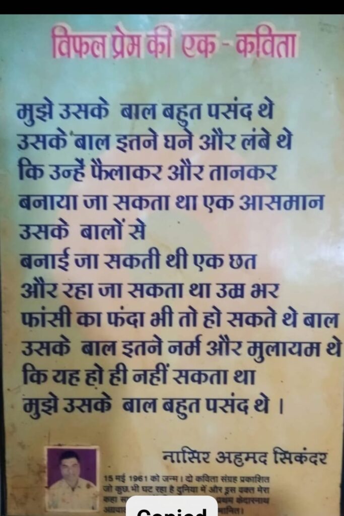 रिसाली भिलाई / छoगo से दुर्ग जिले के नगर पालिक निगम रिसाली के वार्ड क्रमांक-1 निवासी मोगरा-76,ब्लॉक-बी, तालपुरी रिसाली का सेक्टर 9 अस्पताल भिलाई निवासी, देश के प्रसिद्ध कवि व लेखक नासिर अहमद सिकन्दर उम्र 64 वर्षीय (बी एस पी रिटायर ) का आकस्मिक निधन हो गया है। जिनका अंतिम संस्कार (सुपुर्देखाक) आज 29 दिसंबर दिन सोमवार की संध्या पांच बजे रामनगर भिलाई के कब्रिस्तान में होगा। अपने पिछे भरापूरा परिवार छोड़ गए, वे शहरोज व शगुफ्ता के पिता थे।