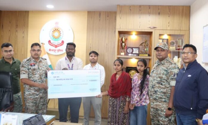 सोमवार को स्टेट बैंक ऑफ इंडिया, बीजापुर शाखा द्वारा शहीद जवान की पत्नी पूजा नाग के नाम जारी 1.10 करोड़ रुपये (एक करोड़ दस लाख रुपये) का चेक पुलिस अधीक्षक बीजापुर डॉ. जितेन्द्र कुमार यादव ने सौंपा।