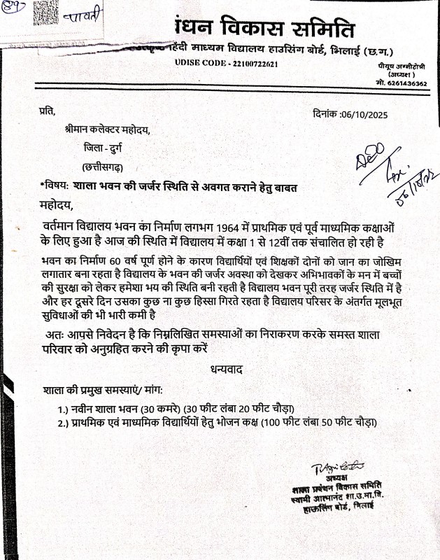 सोमवार को होने वाले जनदर्शन कार्यक्रम मे जर्जर शासकीय उच्चतर माध्यमिक विद्यालय हाउसिंग बोर्ड भिलाई के भवन का नव निर्माण कराने शाला प्रबंधन समिति ने कलेक्टर को सौपा ज्ञापन : स्वामी आत्मानंद उत्कृष्ट हिंदी माध्यम शासकीय उच्चतर माध्यमिक विद्यालय, हाउसिंग बोर्ड भिलाई के भवन का निर्माण सन् 1964 में हुआ है जो 60 वर्ष पुराना होने के कारण भवन जर्जर स्थिति में है. भवन का हिस्सा आए दिन गिरते रहता है, भवन की जर्जर स्थिति के कारण बच्चों के अभिभावकों एवं शिक्षकों में बच्चों की सुरक्षा को लेकर हमेशा भय की स्थिति बनी रहती है. शाला परिसर की इस समस्याओं को यथा शीघ्र दूर करने की लिए शाला प्रबंधन विकास समिति के प्रतिनिधि मंडल द्वारा जिला कलेक्टर को अवगत कराया एवं शाला भवन के नव निर्माण हेतु ज्ञापन सौंपा गया. शाला प्रबंधन विकास समिति के प्रतिनिधि मंडल में प्रमुख रूप से शाला प्रबंधन विकास समिति अध्यक्ष पीयूष अग्निहोत्री, भाजपा नेता दिलीप सिंह, कृष्णा द्विवेदी, जयंत शर्मा , राजेंद्र सोनी आदि उपस्थित रहे.