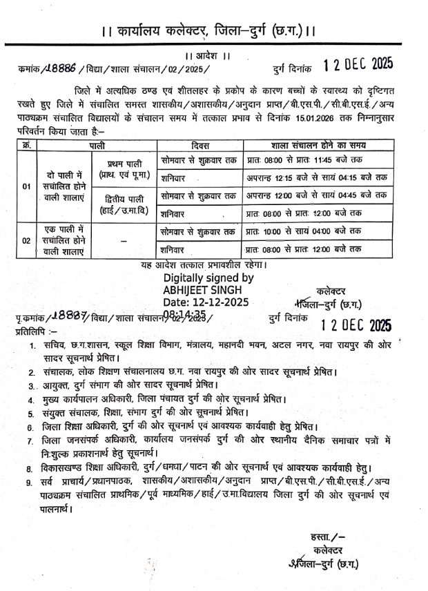 दुर्ग जिले में पिछले कुछ दिनों से लगातार अत्यधिक ठंड और शीतलहर पड़ रही है, जिसके कारण कलेक्टर अभिजीत सिंह ने आदेश जारी कर स्कूलों के समय में बदलाव किया है। जिला कलेक्टर ने किया है आदेश : 15 जनवरी 2026 तक जिले के सभी अशासकीय, शासकीय स्कूलों का समय बदला गया है। वहीं निगम प्रशासन ने सार्वजनिक स्थानों और रैन बसेरा में अलाव की व्यवस्था भी की जायेगी ।