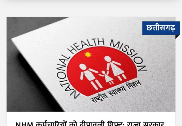 रायपुर, 11 अक्टूबर । राज्य शासन ने नेशनल हेल्थ मिशन (एनएचएम) के कर्मियों को दिवाली के पहले 5 प्रतिशत वेतन वृद्धि का तोहफा दिया है. 1 जुलाई 2023 से वेतन वृद्धि का लाभ दिया जाएगा.