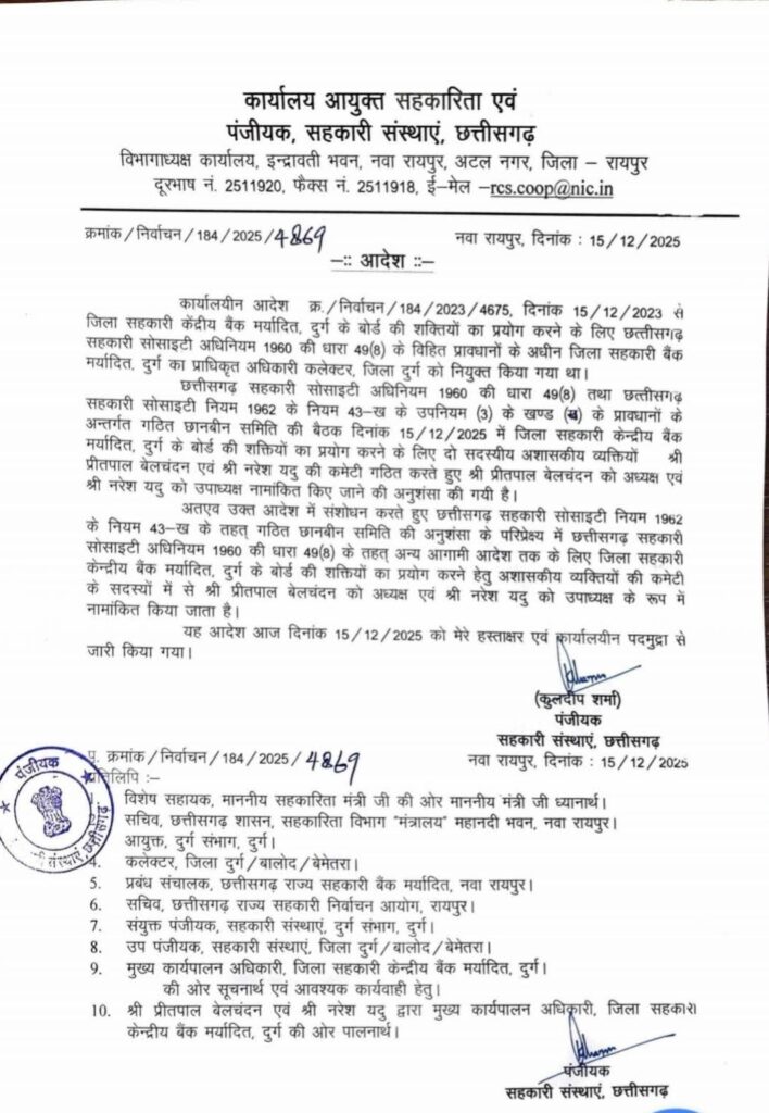 रायपुर,16 दिसंबर 2025/ कार्यालय आयुक्त, सहकारिता एवं पंजीयक, सहकारी संस्थाएं द्वारा दुर्ग, अंबिकापुर, बिलासपुर, राजनांदगांव और जगदलपुर जिला सहकारी केंद्रीय बैंक में अध्यक्ष और उपाध्यक्ष की नियुक्ति की गई है। यह नियुक्ति छानबीन समिति की बैठक में की गई अनुशंसाओं के आधार पर की गई है।