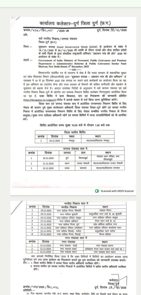 दुर्ग 18 दिसंबर / नगरीय निकाय एवं जनपद पंचायत जिला-दुर्ग (छ.ग.) सुशासन सप्ताह के आयोजन के संबंध में 19 दिसंबर से 25 दिसंबर 2025 की अवधि के दौरान राज्यों और केन्द्र शासित प्रदेशों के सभी जिलो के द्वारा संचालित राष्ट्रव्यापी अभियान “प्रशासन गांव की ओर 2025 का आयोजन किया गया है,
