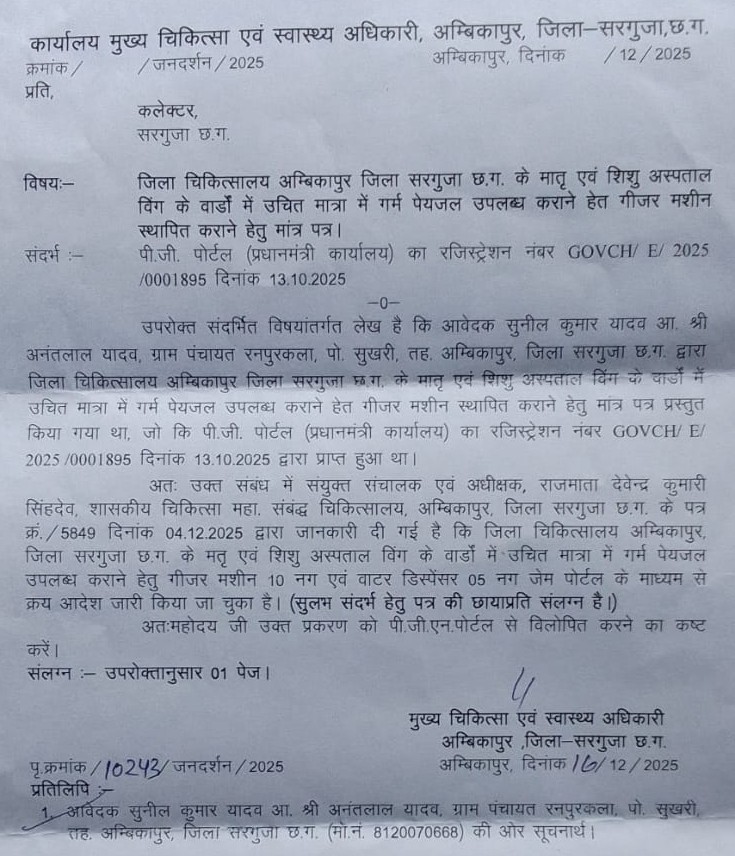 जो कि पी.जी. पोर्टल (प्रधानमंत्री कार्यालय) का रजिस्ट्रेशन नंबर GOVCH/E/2025/0001895 दिनांक 13.10.2025 द्वारा प्राप्त हुआ था। अतः उक्त संबंध में संयुक्त संचालक एवं अधीक्षक, राजमाता देवेन्द्र कुमारी सिंहदेव, शासकीय चिकित्सा महा. संबंद्ध चिकित्सालय, अम्बिकापुर, जिला सरगुजा छ.ग. के पत्र क्रं./5849 दिनांक 04 दिसम्बर को जानकारी दी गई है कि जिला चिकित्सालय अम्बिकापुर, जिला सरगुजा छ.ग. के मातृ एवं शिशु अस्पताल विंग के वार्डों में उचित मात्रा में गर्म पेयजल उपलब्ध कराने हेतु गीजर मशीन 10 नग एवं वाटर डिस्पेंसर 05 नग जेम पोर्टल के माध्यम से क्रय आदेश जारी किया जा चुका है।