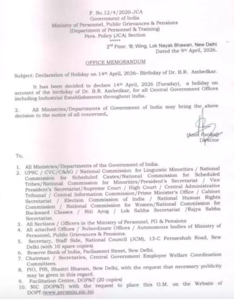 HomeBlogअम्बेडकर जयंती के अवसर पर 14 अप्रेल मंगलवार को केंद्र सरकार ने... Blogदेश विदेश अम्बेडकर जयंती के अवसर पर 14 अप्रेल मंगलवार को केंद्र सरकार ने किया छुट्टी का ऐलान.. By संपादक :- पन्ना लाल यादव 13 April 2026 0 69 Share FacebookTwitterPinterestWhatsApp सीजी प्रतिमान न्यूज़ / डाँ.अम्बेडकर जी की जयंती के अवसर पर 14 अप्रेल मंगलवार को केंद्र सरकार ने किया छुट्टी का ऐलान, देखिए आदेश… Share FacebookTwitterPinterestWhatsApp Previous articleभिलाई – मरोदा मंडल देवांगन समाज का त्रिवार्षिक चुनाव रविवार को हुआ निर्विरोध सम्पन्न..Next articleग्राम सभाओं का आयोजन 14 अप्रैल को, विभिन्न विषयों पर होगी विस्तृत चर्चा। संपादक :- पन्ना लाल यादव RELATED ARTICLES Blog छत्तीसगढ़ बोर्ड 10वीं और 12वीं बोर्ड परीक्षा 2026 के परिणाम हुआ जारी : यादव समाज की बिटिया 12वीं में आशा यादव और... 29 April 2026 Blog दुर्ग-बेमेतरा मार्ग के पावरग्रिड चौक पर लिफ्ट गैंग सक्रिय, आधी रात को राहगीरों को घेरने की कोशिश.. 29 April 2026 Blog पूर्व मुख्यमंत्री भूपेश बघेल के संबंध मे आपतिजनक एवं तथ्यहीन वीडियो पोस्ट करने वालो के खिलाफ,अंडा थाने में ब्लॉक कांग्रेस कमेटी दुर्ग-ग्रामीण के कार्यकर्ताओ... 27 April 2026 - Advertisment - - Advertisment - Most Popular झेरिया धोबी समाज परिक्षेत्र जामुल का एक दिवसीय वार्षिक सम्मेलन एवं सम्मान समारोह का आयोजन ग्राम ढौर में 3 मई रविवार को है आयोजित… रामलला दर्शन योजना के तहत दुर्ग से श्रद्धालुओं का जत्था हुआ रवाना छत्तीसगढ़ में प्रवर्तन निदेशालय (ED) की टीम ने दुर्ग और बिलासपुर में रेड मारी है। दुर्ग में ‘अमर इंफ्रा’ के संचालक और भाजपा नेता... छत्तीसगढ़ बोर्ड 10वीं और 12वीं बोर्ड परीक्षा 2026 के परिणाम हुआ जारी : यादव समाज की बिटिया 12वीं में आशा यादव और... Load more